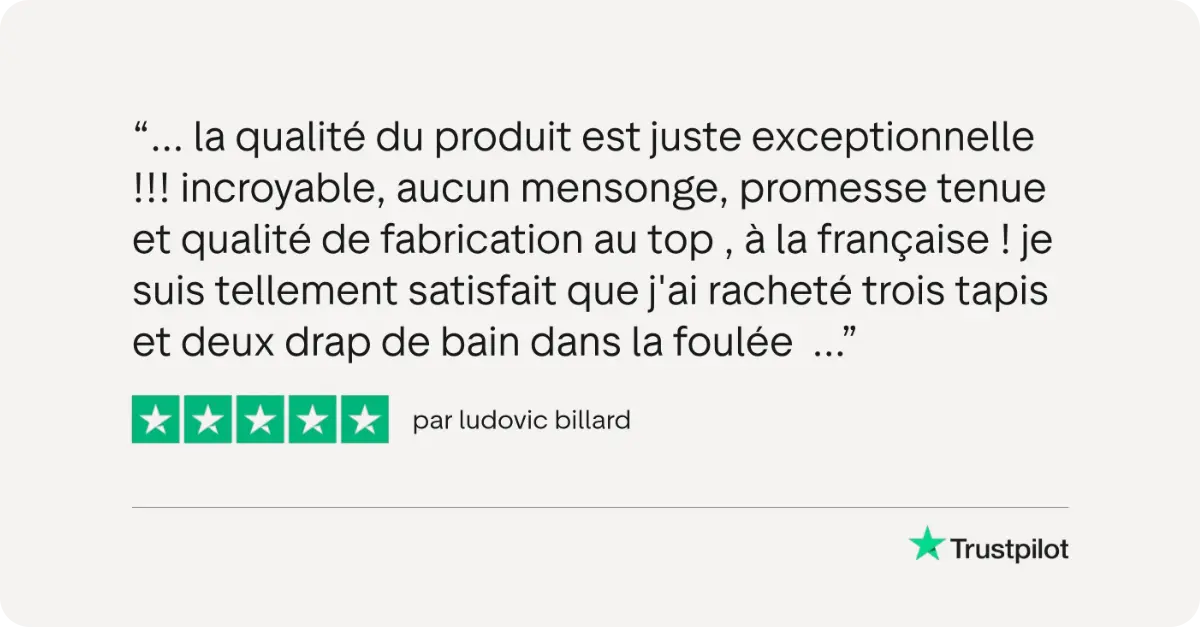 Nous avons relevé le défi de concevoir le tapis de bain le plus moelleux au monde depuis notre atelier. Et nous l’avons conçu pour qu’il résiste à l’épreuve du temps et au quotidien de tout un foyer. Une qualité exceptionnelle, c’est aussi une durabilité exceptionnelle.